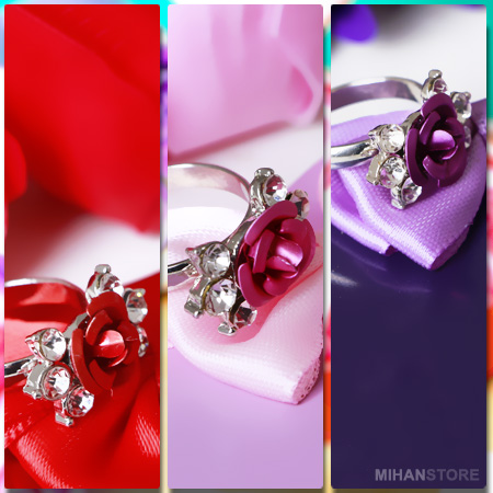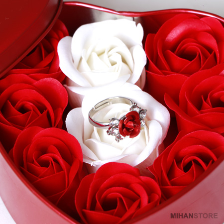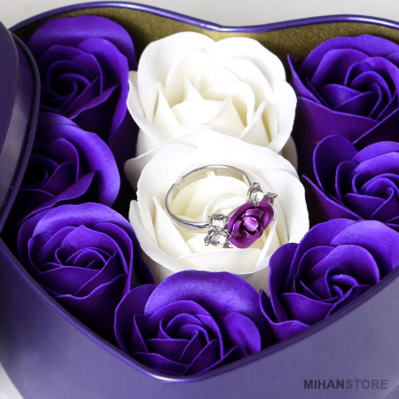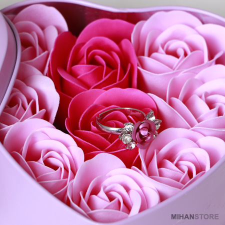 انگشتر فری سایز بسیار زیبا به همراه گل های عطری در پکیج فلزی
