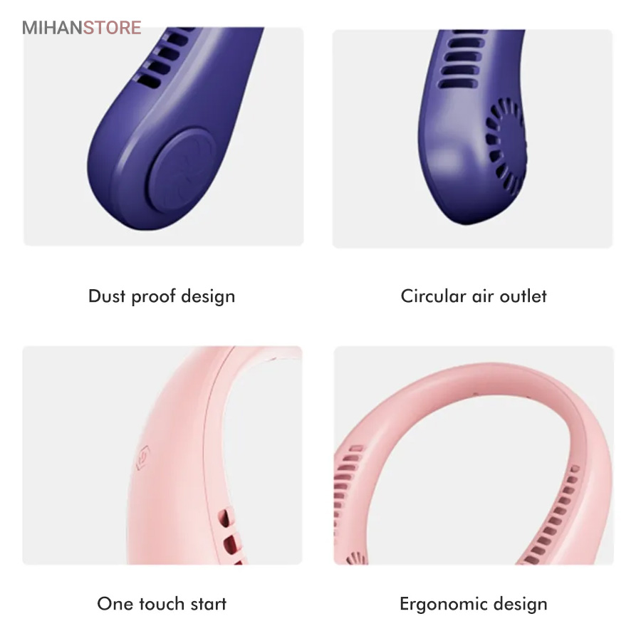 این پنکه همراه به وسیله شیارهای متعددی که روی بدنه خود دارد می‌تواند سر، صورت و گردن شما را خنک کند و شما را از یک هوای گرم نجات ببخشد. این فن راه اندازی سختی هم ندارد و به‌راحتی با فشردن تنها یک دکمه فعال خواهد شد. همان دکمه می‌تواند دما را برای شما کم و زیاد هم کند. سرعت این پنکه در سه حالت قابل تنظیم است که می‌توانید بنا به نیازتان و میزان گرما از  آن‌ها استفاده کنید. موتور این پنکه پر قدرت بوده و بی‌صدا است. این پنکه با اتصال سیم usb به یک شارژر شارژ میشود و نیازی به باطری با سیم همراه ندارد، از این رو شما می‌توانید از این پنکه گردنی همراه در هرمکانی که دوست دارید استفاده کنید. با توجه به جنس و وزن کم این محصول اصلا ضرری را به گردن شما متحمل نمی‌شود. این پنکه به راحتی با زاویه صورت قابل تنظیم است. از طرفی این پنکه بازوهای قابل انعطاف داشته و منعطف است. بنابراین اندازه دلخواه را می‌توانید به راحتی تنظیم کنید.