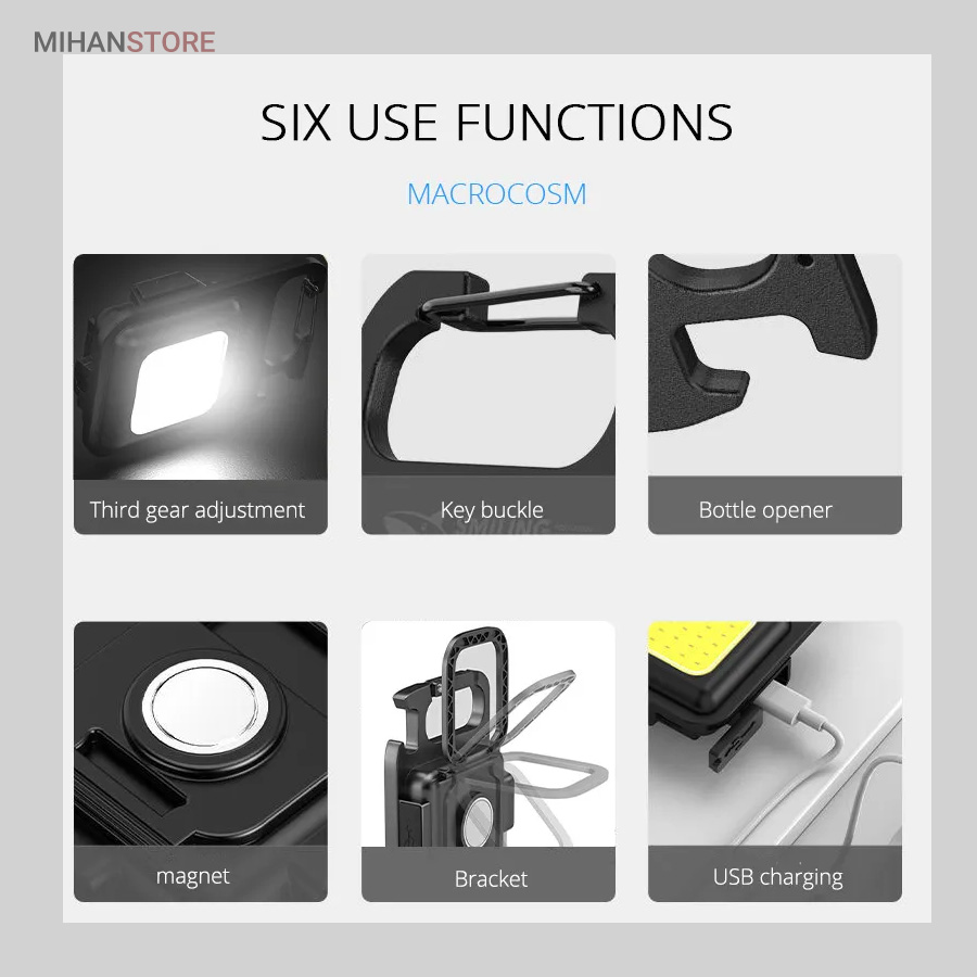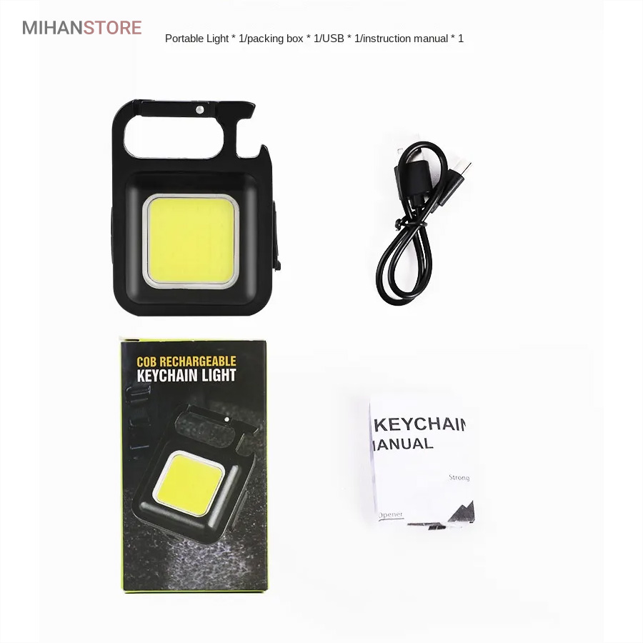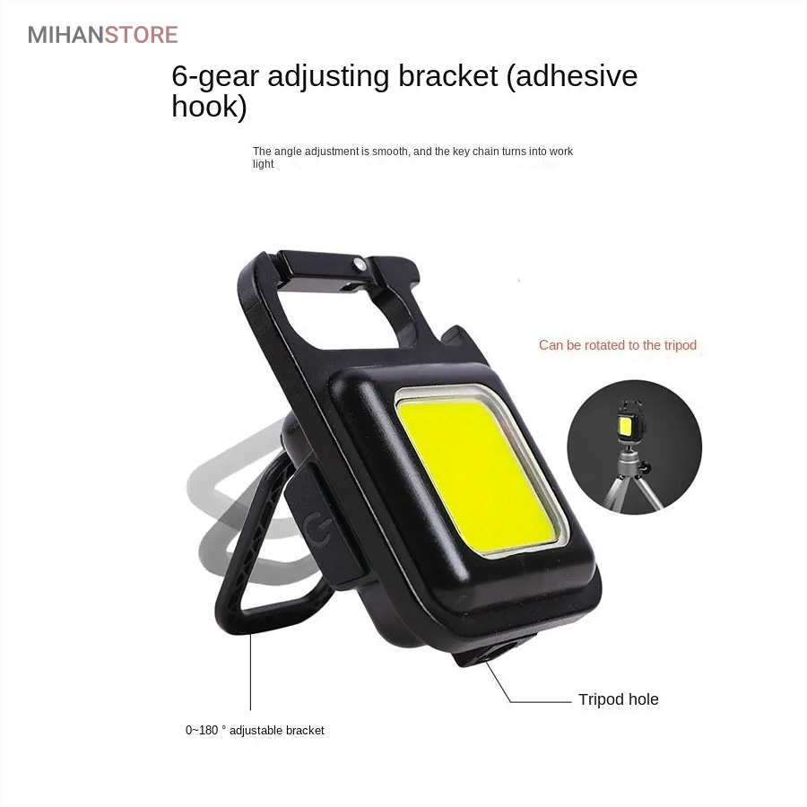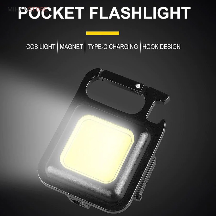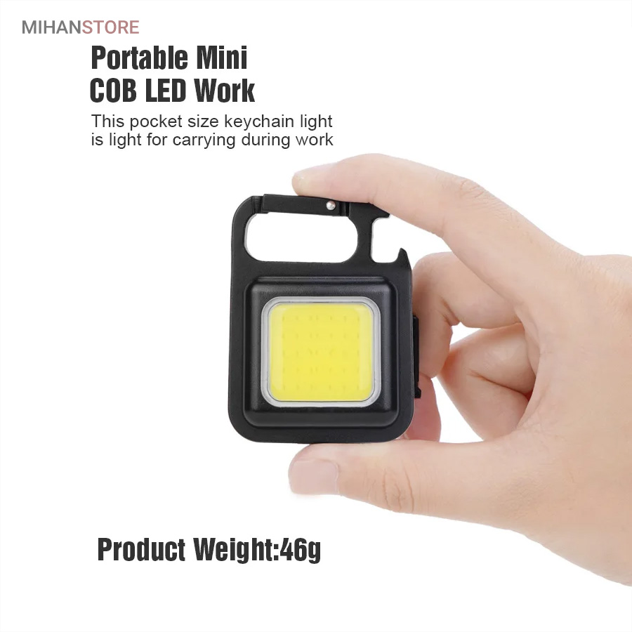 وقتی زمان شارژ  مجدد فرا می رسد، کافی است آن را به هر منبع تغذیه USB وصل کنید. این چراغ  قوه شارژی USB توسط یک باتری داخلی قابل شارژ با ظرفیت 500 میلی آمپر  ساعت، کابل شارژ تایپ C به USB تغذیه می شود. معمولاً حدود 2 ساعت طول  می کشد تا کاملاً شارژ شود. پایه آهنربایی  قوی و دسته قابل چرخش به شما امکان می دهد در حین کار دستان خود را رها  کنید. طراحی آهنربا به لامپ اجازه می دهد تا به هر فلزی متصل شود و دسته  قابل تاشو 180 درجه اجازه می دهد تا لامپ در زوایای مختلف قرار گیرد یا در  مکان های خاصی آویزان شود.این چراغ قوه  جاکلیدی می تواند نورهایی با حداکثر 800 لومن ساطع کند. این یک نور روشن با  زاویه گسترده ارائه می دهد. LED فنی بزرگ COB اجازه می دهد تا از این چراغ  به عنوان چراغ کار کوچک و چراغ اضطراری استفاده شود. چراغ قوه قابل حمل دارای کارابینی است که به راحتی به حلقه کلید یا کیف وصل می شود و در  برابر آب و ضربه مقاوم است. از طرف دیگر، بطری بازکن خوبی است. شما می  توانید از آن در سناریوهای مختلفی مانند کمپینگ، پیاده روی سگ، جستجوی  چیزها، تعمیر استفاده کنید.