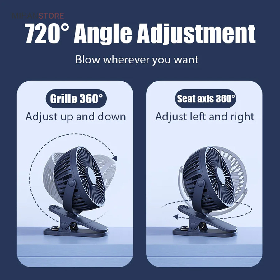 این پنکه می تواند گزینه مناسبی برای زمانی باشد که شما به برق دسترسی ندارید و یا برق رفته است. باطری این پنکه شارژ می شود و می توانید از آن بدون نیاز به اتصال مداوم به برق استفاده کنید. قدرت پرتاب هوا توسط پره های این پنکه با توجه به ساخت متفاوت بسیار بالا است و گردش هوای مناسب و قوی تری ایجاد می کند.این پنکه قدرت انتخاب سه سرعت را به فرد می دهد که با توجه به شرایط فرد انتخاب می کند کدام سرعت را تنظیم کرده و استفاده کند.دارای گیره اتصال برای متصل نمودن به میز یا دستگیره و یا دسته صندلی یا داخل ماشیناین پنکه از سایز خوبی برخوردار است که می توان آن را داخل کیف قرار داده و با خود حمل کنید.یکی دیگر از ویژگی های این پنکه حالت چرخش 360 درجه آن است که با توجه به نیازتان می توانید جهت آن را تنظیم کنید. این پنکه دارای LED در داخل پنکه می باشد که هنگام کار کردن زیبایی خاصی به محصول می بخشد.