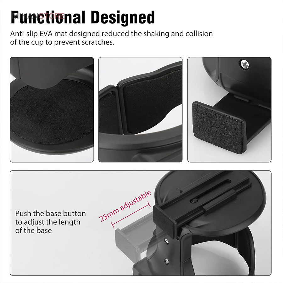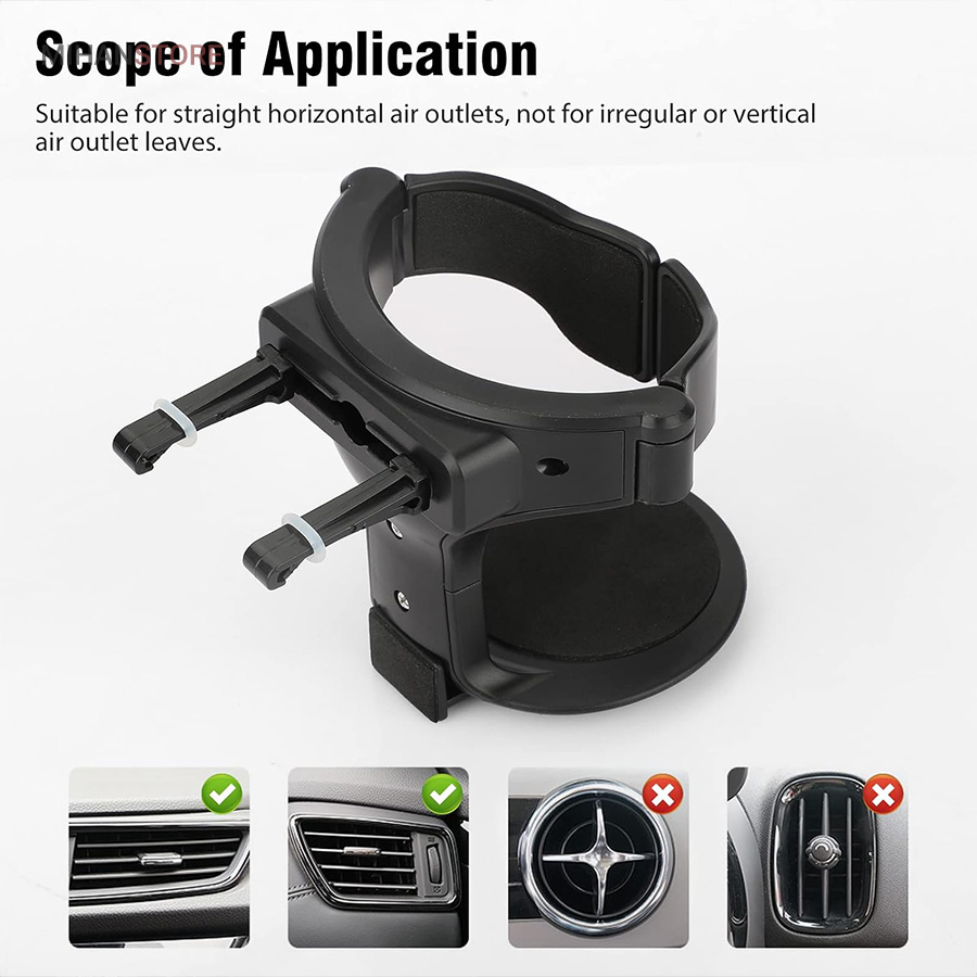 جا لیوانی از مواد کاملاً جدید ABS و بالشتک ساخته شده است تا صدا و لرزش را در حین رانندگی کاهش دهد. طول دسته پایه را می توان با توجه به تمایل داشبورد تنظیم کرد. اطمینان حاصل کنید که نگهدارنده را می توان صاف و محکم قرار داد. این محصول مناسب برای خودروهایی که شیارهای تهویه مطبوع آنها افقی می باشد قابل استفاده است.