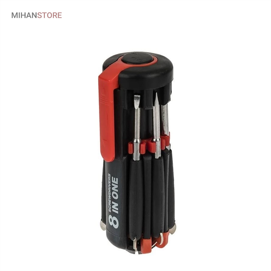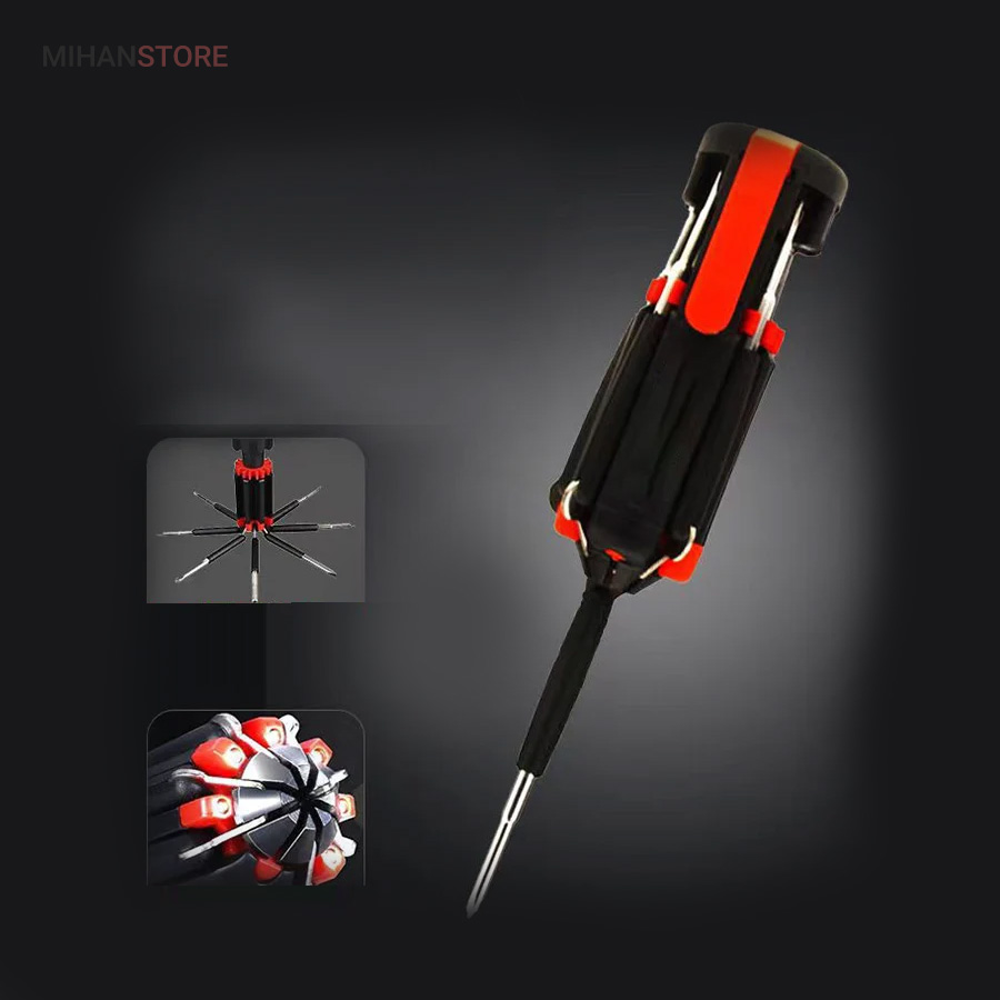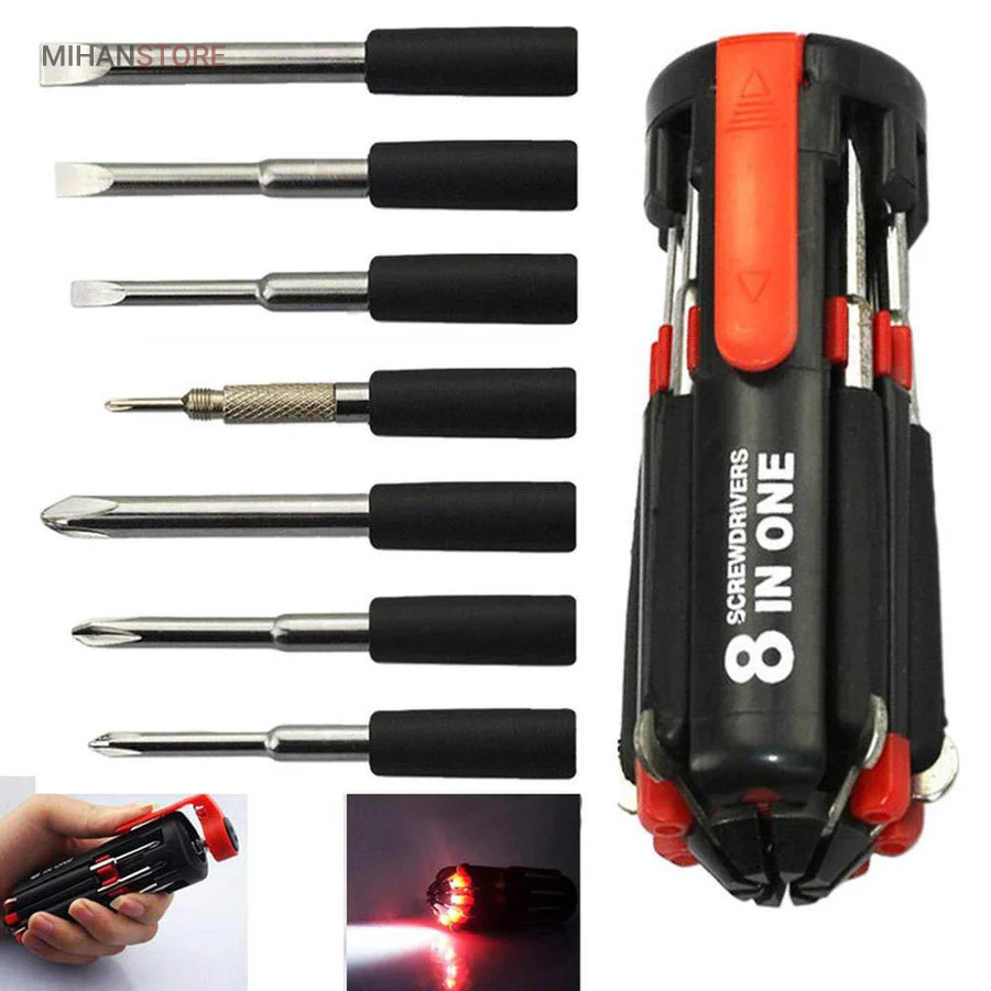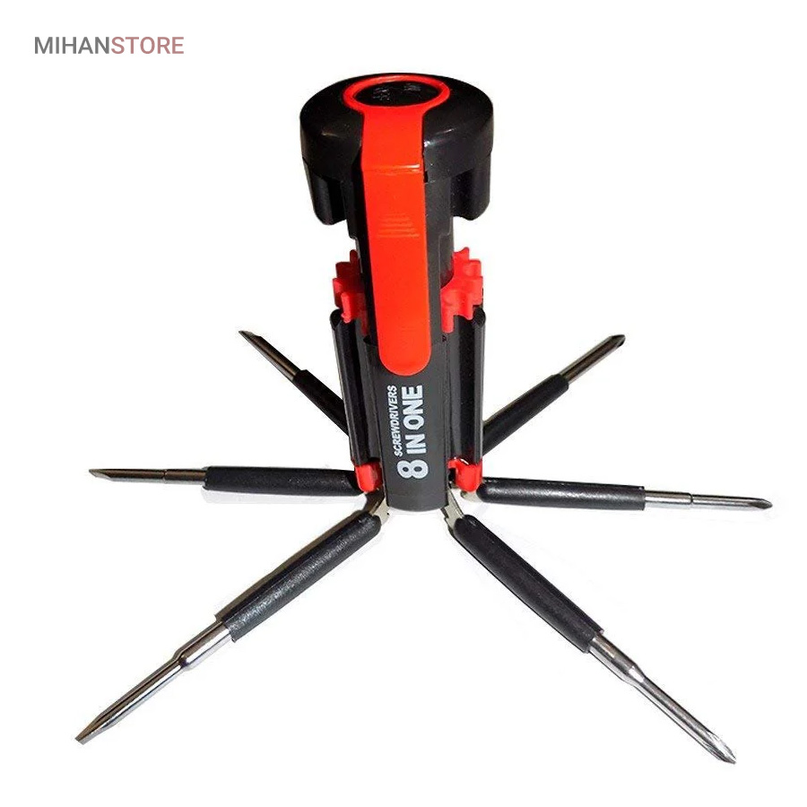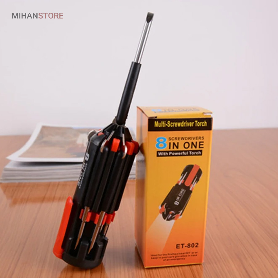 یک پیچ گوشتی به جای 8 پیچ گوشتی ، هشت پیچ گوشتی همه کاره .  پیچ گوشتی چند کاره و چراغ دار . نوع درجه یک ،  قابل استفاده داخل اتومبیل ، منزل و محل کار با 8 سر متفاوت مناسب برای تمام کارهای فنی . این پیچ گوشتی چراغ دار از جدید ترین و مناسب ترین پیچ گوشتی ها بوده که تابحال وارد بازار شده که به جای استفاده از 8 پیچ گوشتی شما می توانید از یک پیچ گوشتی 8 سر استفاده کنید.این پیچ گوشتی قابل حمل ، بدون نیاز به جعبه می باشد. پیچ گوشتی 8 سر جادویی چراغ دار قابل استفاده در محیطهای تاریک.پیچ گوشتی چند کاره و چراغ دار به همراه چراغ قوه برای کار کردن در محیط های تاریک نیز مناسب می باشد.