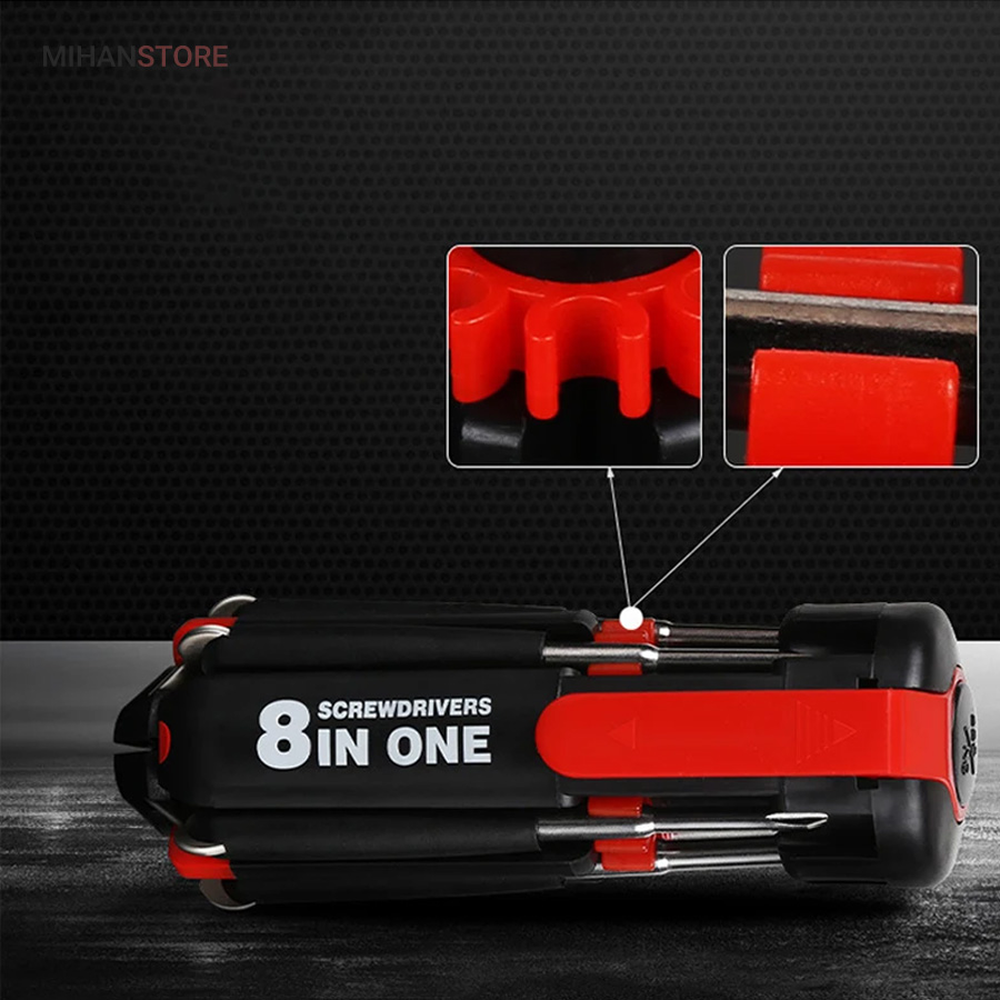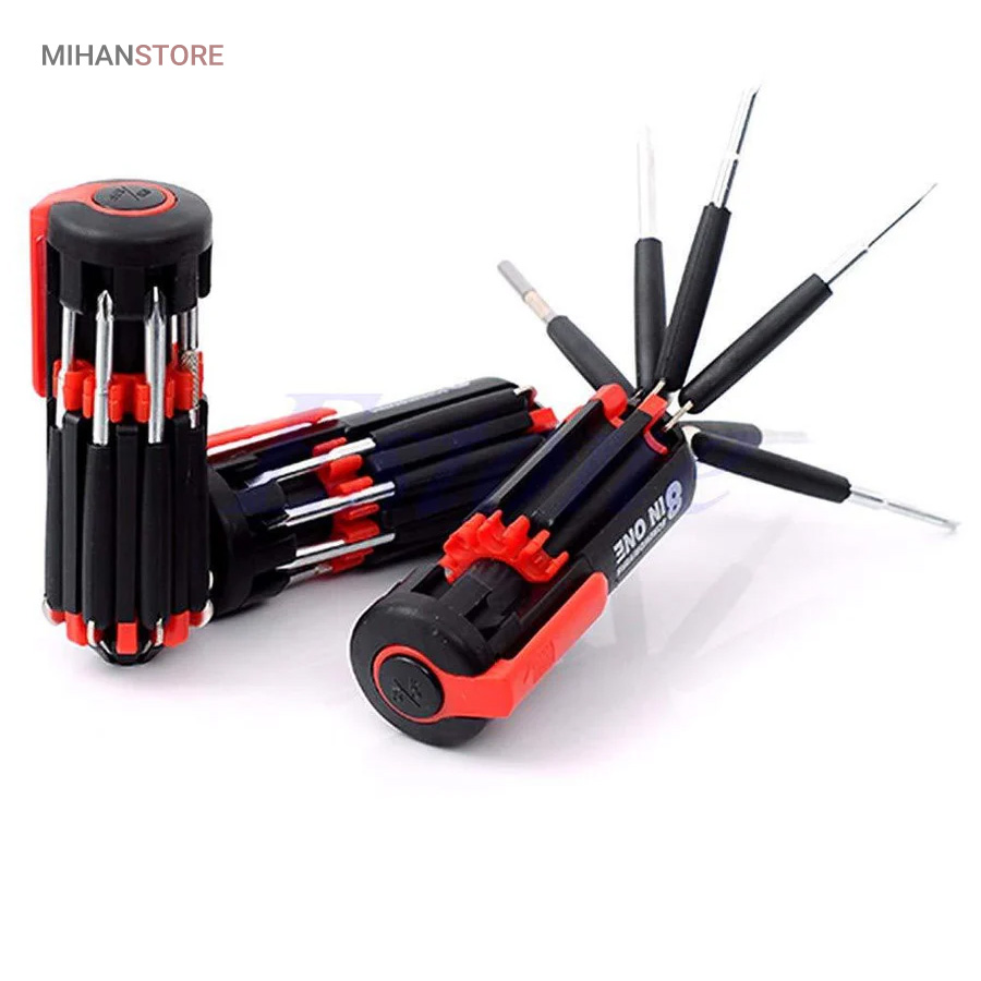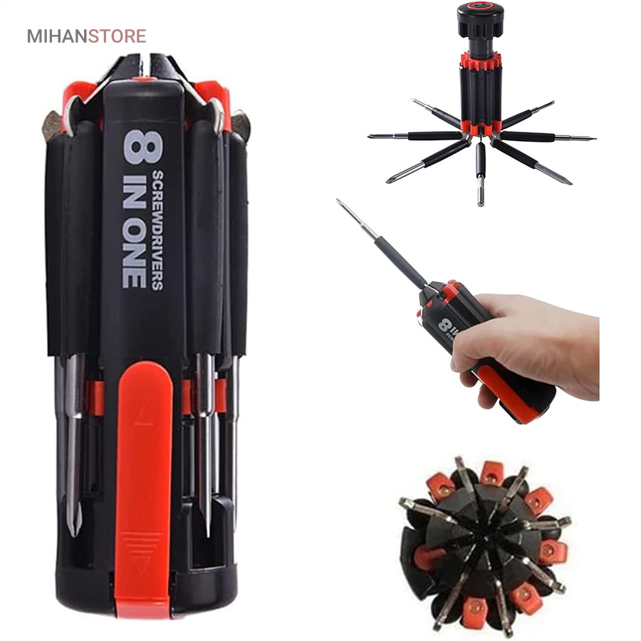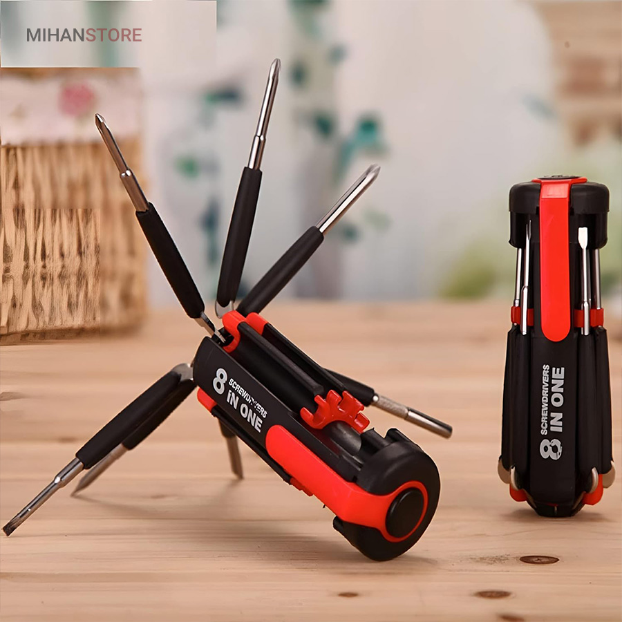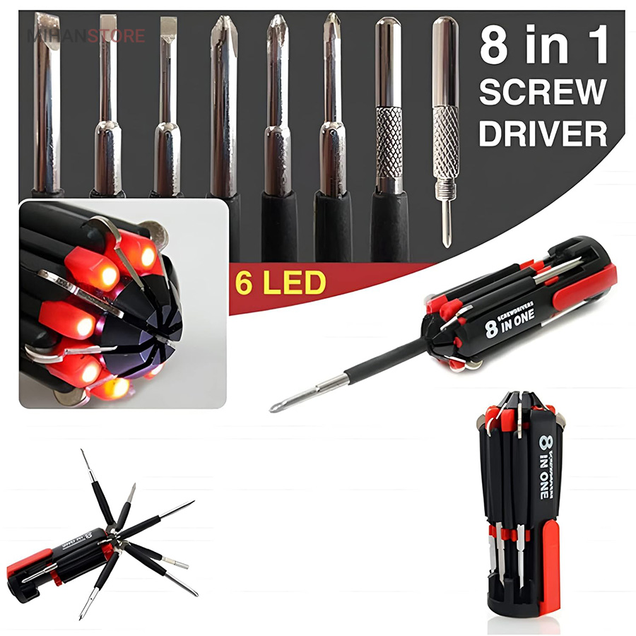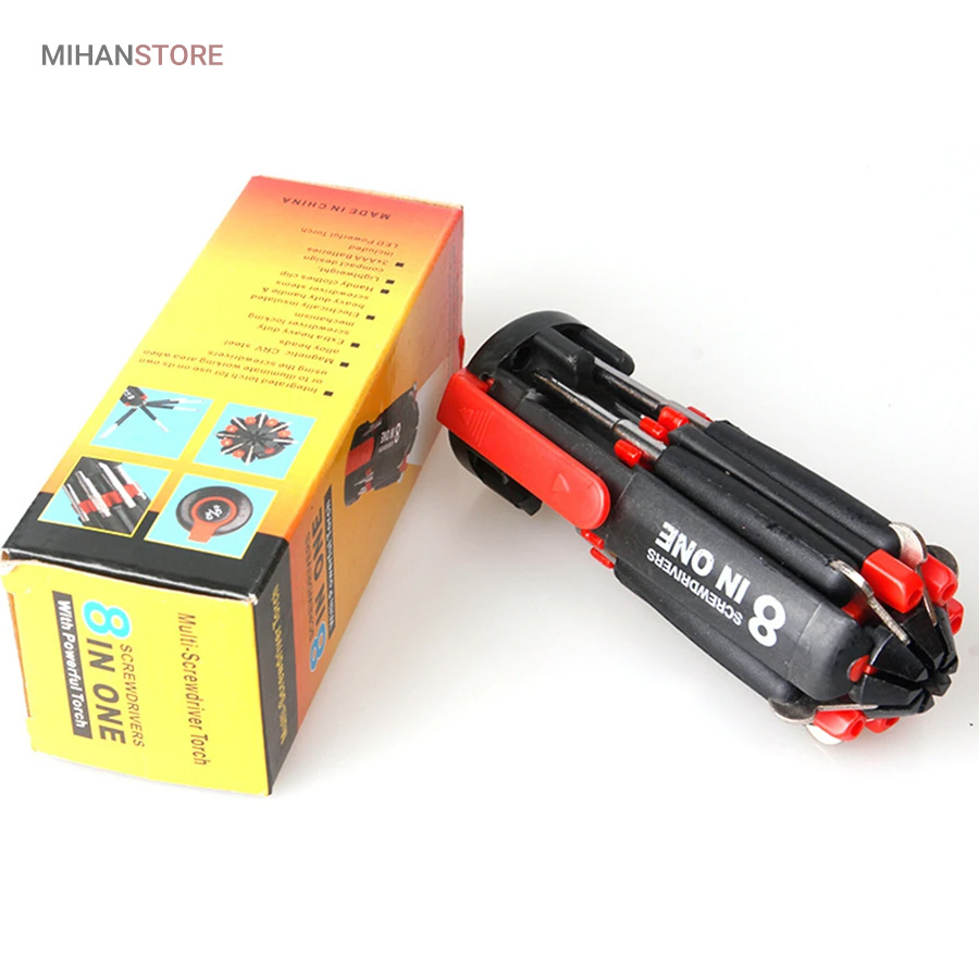 یک پیچ گوشتی به جای 8 پیچ گوشتی ، هشت پیچ گوشتی همه کاره .  پیچ گوشتی چند کاره و چراغ دار . نوع درجه یک ،  قابل استفاده داخل اتومبیل ، منزل و محل کار با 8 سر متفاوت مناسب برای تمام کارهای فنی . این پیچ گوشتی چراغ دار از جدید ترین و مناسب ترین پیچ گوشتی ها بوده که تابحال وارد بازار شده که به جای استفاده از 8 پیچ گوشتی شما می توانید از یک پیچ گوشتی 8 سر استفاده کنید.این پیچ گوشتی قابل حمل ، بدون نیاز به جعبه می باشد. پیچ گوشتی 8 سر جادویی چراغ دار قابل استفاده در محیطهای تاریک.پیچ گوشتی چند کاره و چراغ دار به همراه چراغ قوه برای کار کردن در محیط های تاریک نیز مناسب می باشد.