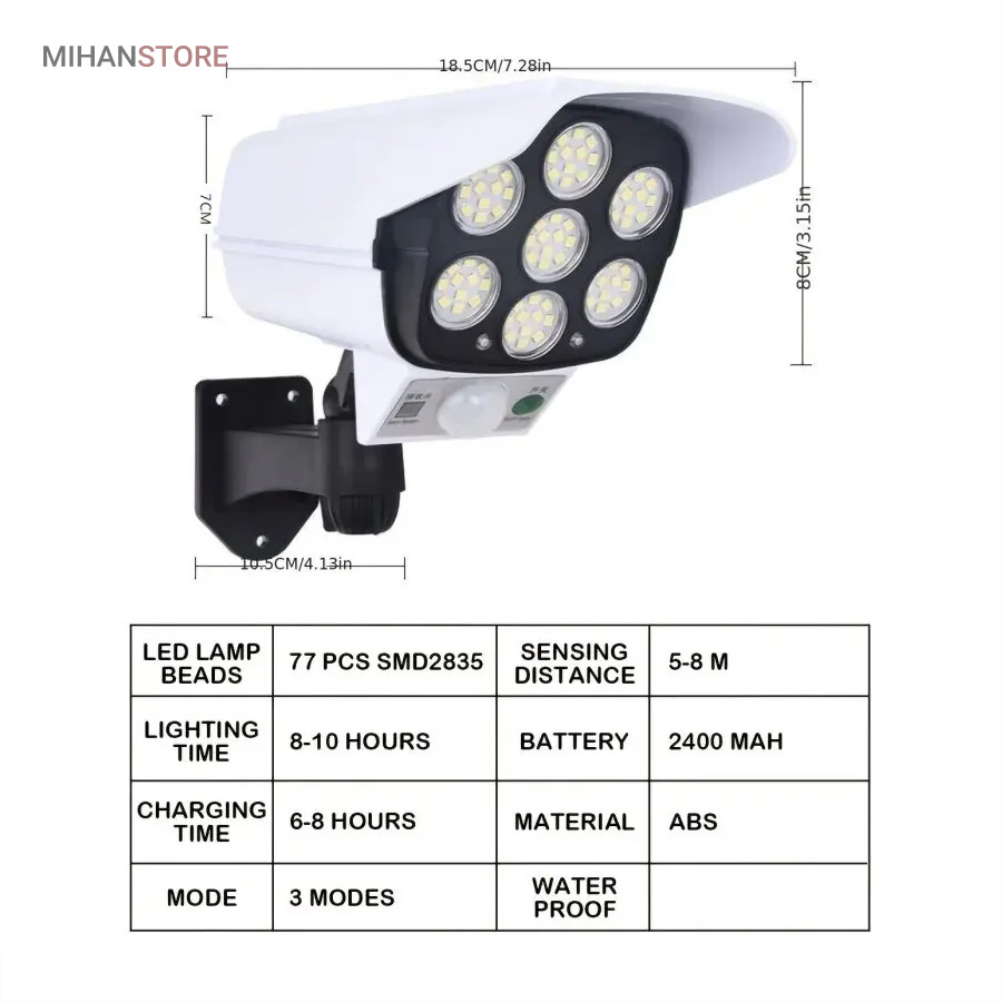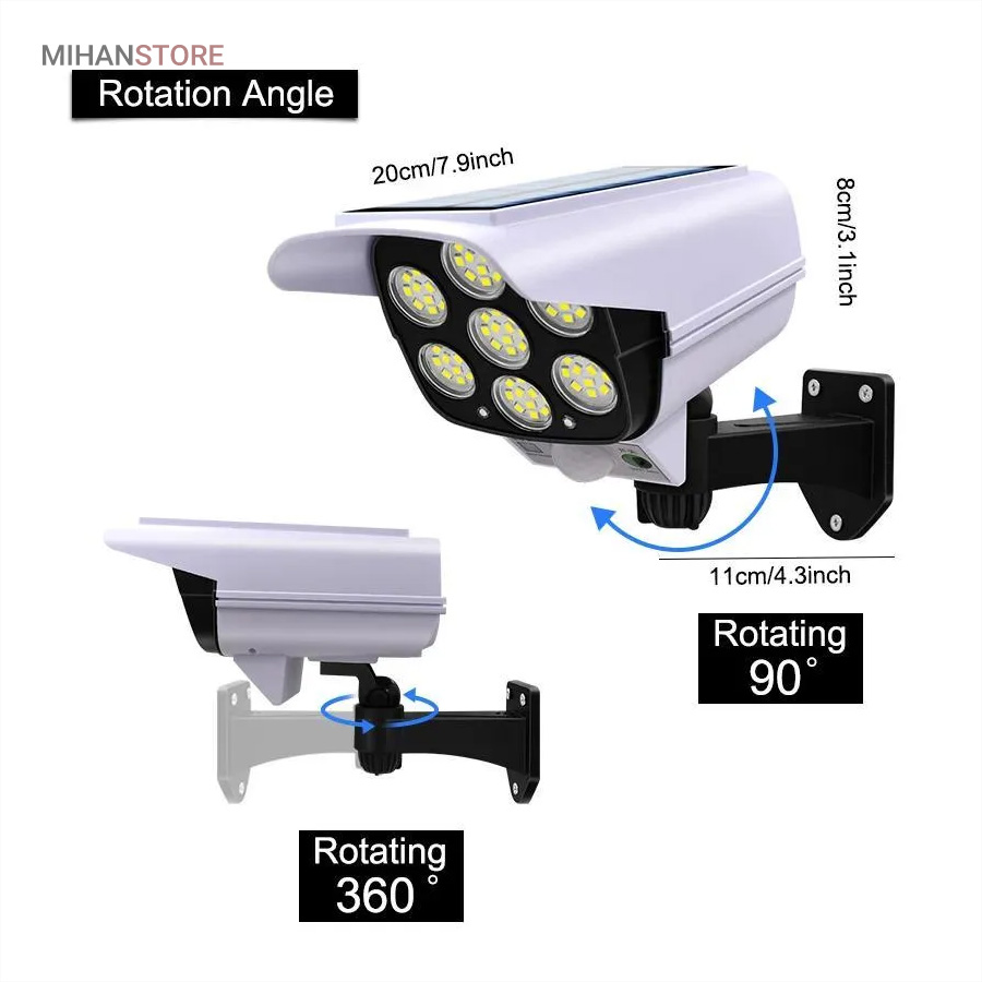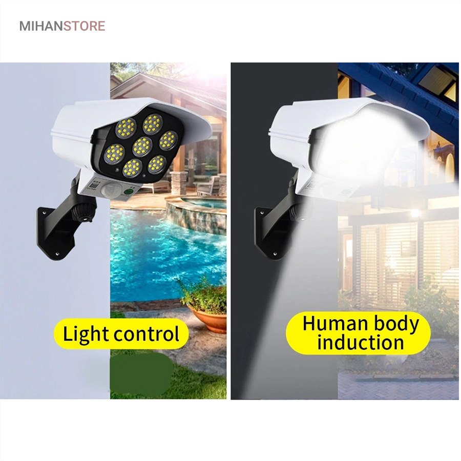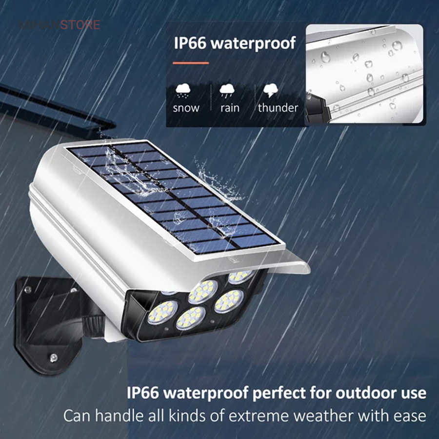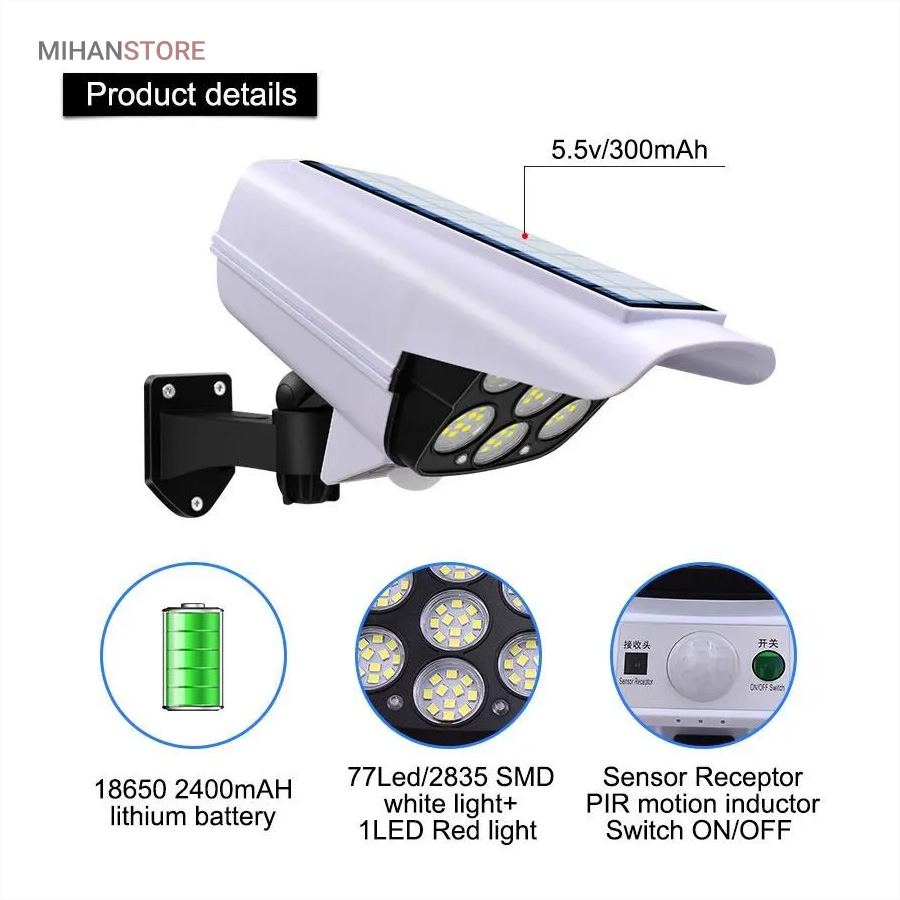 پروژکتور های خورشیدی طرح دوربین مدار بسته پروژکتور هایی هستند که حالت سیکوریتی دارند و حدودا بین 180 تا 200 وات نور تولید می کنند و شامل دو باتری لیتیومی 3.7 ولتی و پنل 3 واتی بزرگ هستند. دوربین های به کار رفته در این پروژکتور ها 2 باتری هستند و کیفیت بالاتری دارند در صورتی که دوربین های موجود در بازار به صورت تک باتری نیز وجود دارد. توانایی تابش 360 درجه دارند و پایه دارند. این نوع پروژکتور ها حتما باید زیر آفتاب باشند ولی در سایه نیز می توانند کار کنند اما نوری که ایجاد می کنند کمتر است و بازدهی کمتری دارند در این صورت باتری زودتر خراب می شود. بهتر است از این نوع پروژکتور ها در مکان های پر تردد استفاده شود. نور بسیار خوبی دارند و ارتفاع نصب آن ها بهتر است که بیش از 3 متر نباشد چرا که اگر سنسور PRD در ارتفاع بیش از 3 متر قرار گیرد حساسیت خود را از دست می دهد و قابلیتی که باید داشته باشد را ندارد. از روی پنل در این پروژکتور ها می توان متوجه خاموش یا روشن بودن آن شد به این صورت که  مدار هایی درون آن وجود دارد که با تغییر ولتاژ از پنل و صفر شدن پنل، شب شدن یا تاریک شدن تشخیص داده می شود یعنی سنسور پتانسیلی دارند و همچنین دارای ریموت هستند. این نوع از پروژکتور ها را می توان زمان بندی کرد. این پروژکتور ها از پر فروش ترین جنس ها هستند.این یک لامپ دیواری خورشیدی با طراحی ظاهری دوربین مداربسته شبیه سازی است که می تواند در مکان های مختلف مانند دروازه ، راهرو ، حیاط و غیره نصب شود.