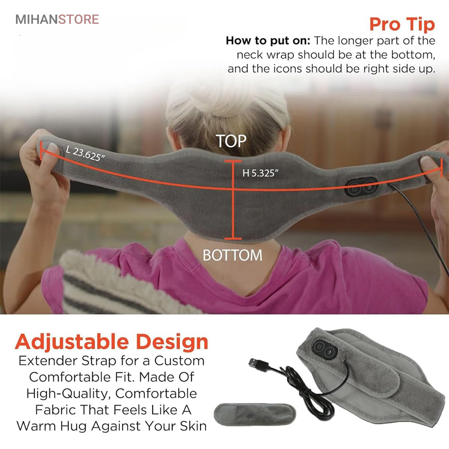 ماساژور و پد حرارتی برقی گردن با هدف تسکین درد و کمک به بهبود دردهای ناحیه گردن کمک میکند و به صورت حوله ای بسیار نرم بر روی ناحیه گردن بسته میشود. گرمای تسکین دهنده و ارتعاشات آرامش بخش سنگ های معدنی همراه با تنظیم گرما و ارتعاشات ماساژ با کیفیت بالا از قابلیت های این ماساژور میباشد همچنین پوشش پارچه ای 100% پلی استر و دانه های پرکننده 77% دانه های سفالی ، ‌23% نمد الیاف پلی استر و دارای بند قابل تنظیم میباشد.
