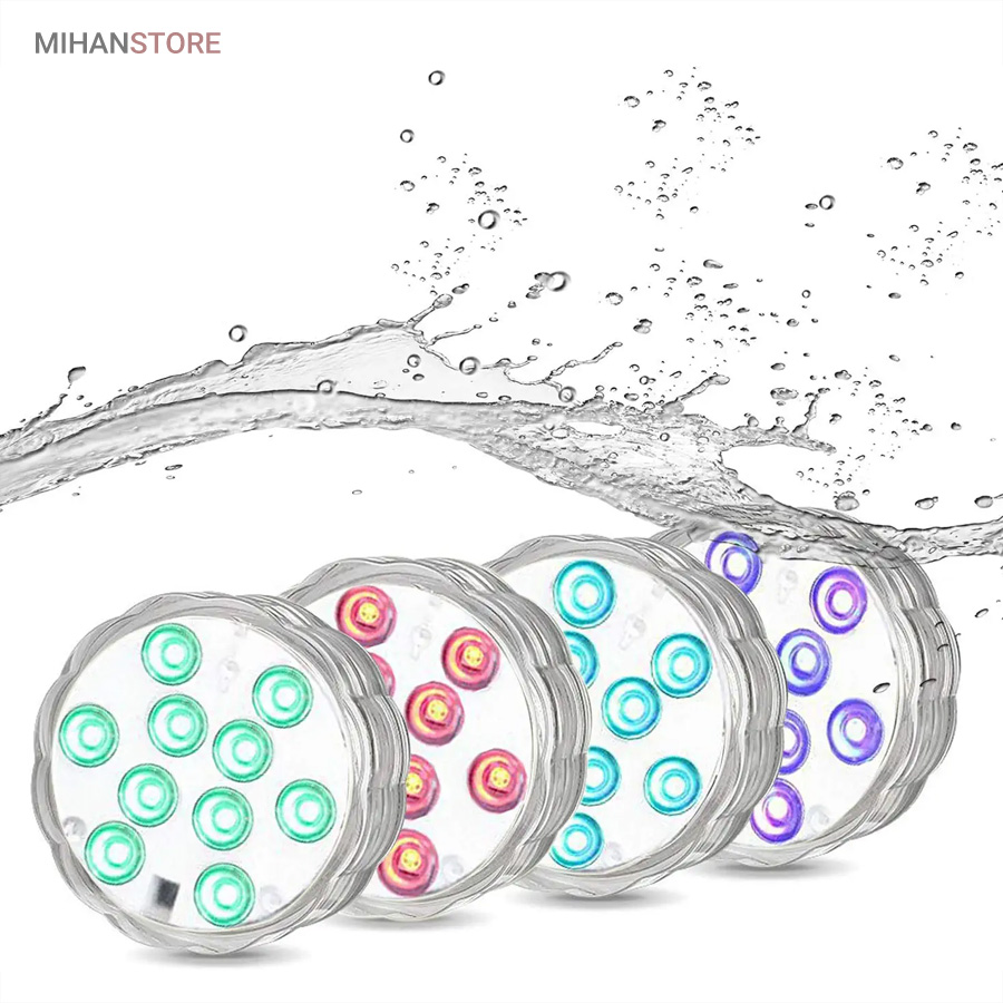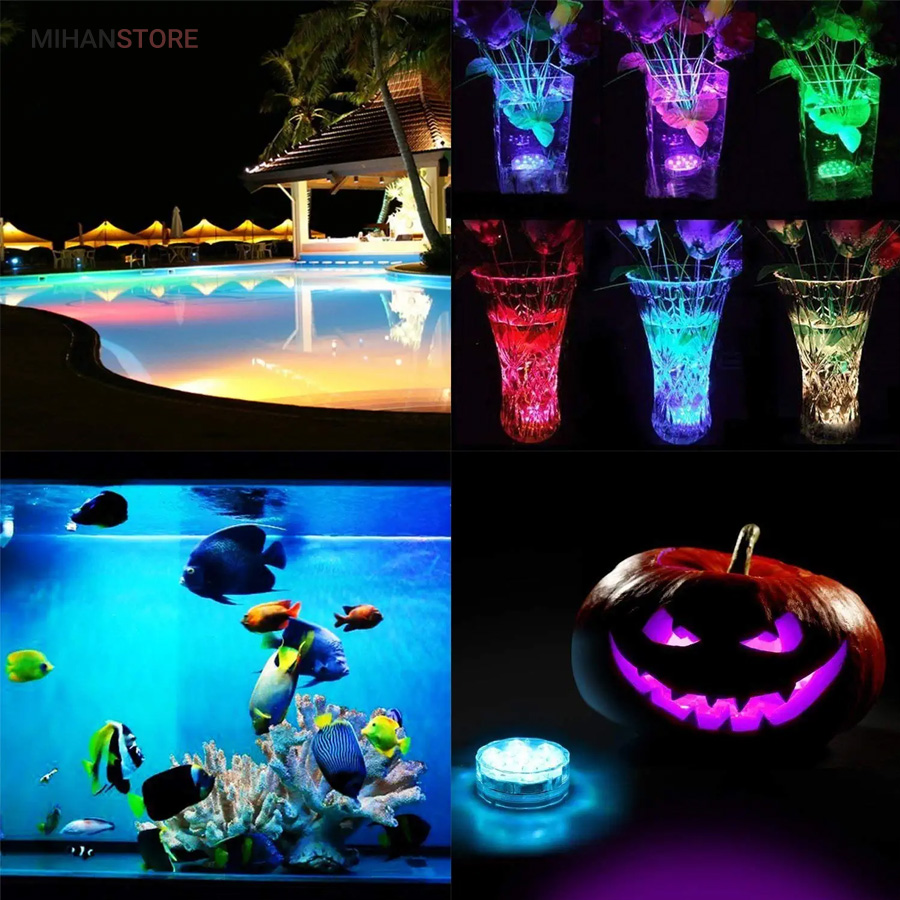 چراغ LED ریموت دار ضد آب دارای LED RGB قابلیت تولید انواع رنگها را دارد. ضمنا با توجه به داشتن ریموت کنترل امکان کنترل از راه دور را فراهم میکند. این پک LED می تواند رنگها و نورها را بصورت مستقل و یا ترکیبی و با حالتهای متفاوت در سرعت چشمک زدن و تغییر رنگها از طیفی به طیف دیگر برای ایجاد جذابیت تولید نماید. با استفاده از 3 عدد باتری نیم قلمی امکان کار تا 72 ساعت بصورت مداوم برای این لامپ وجود دارد.