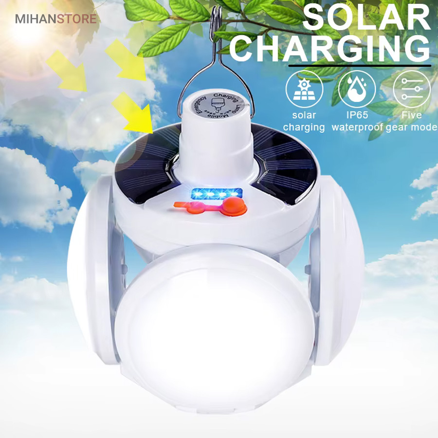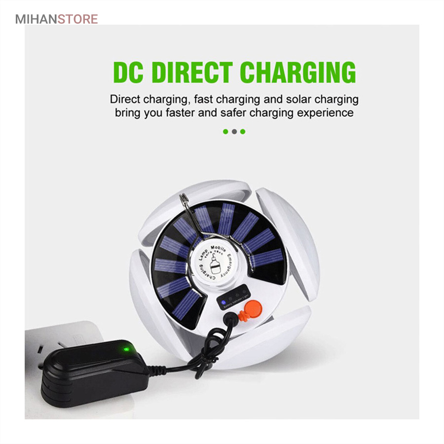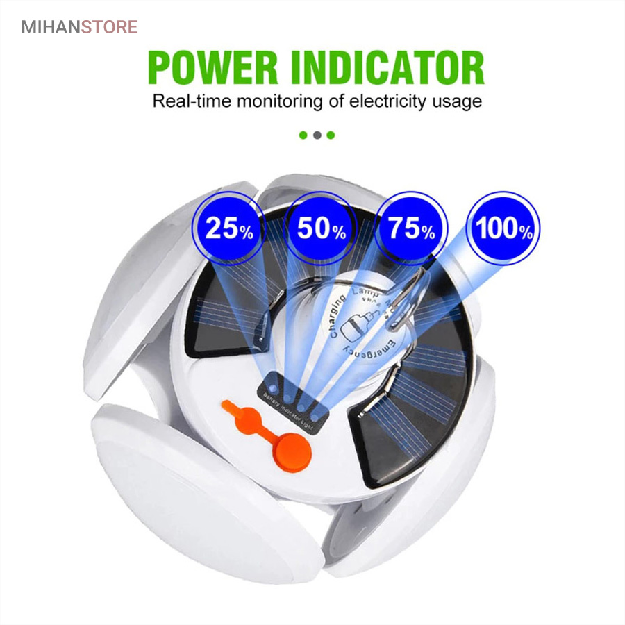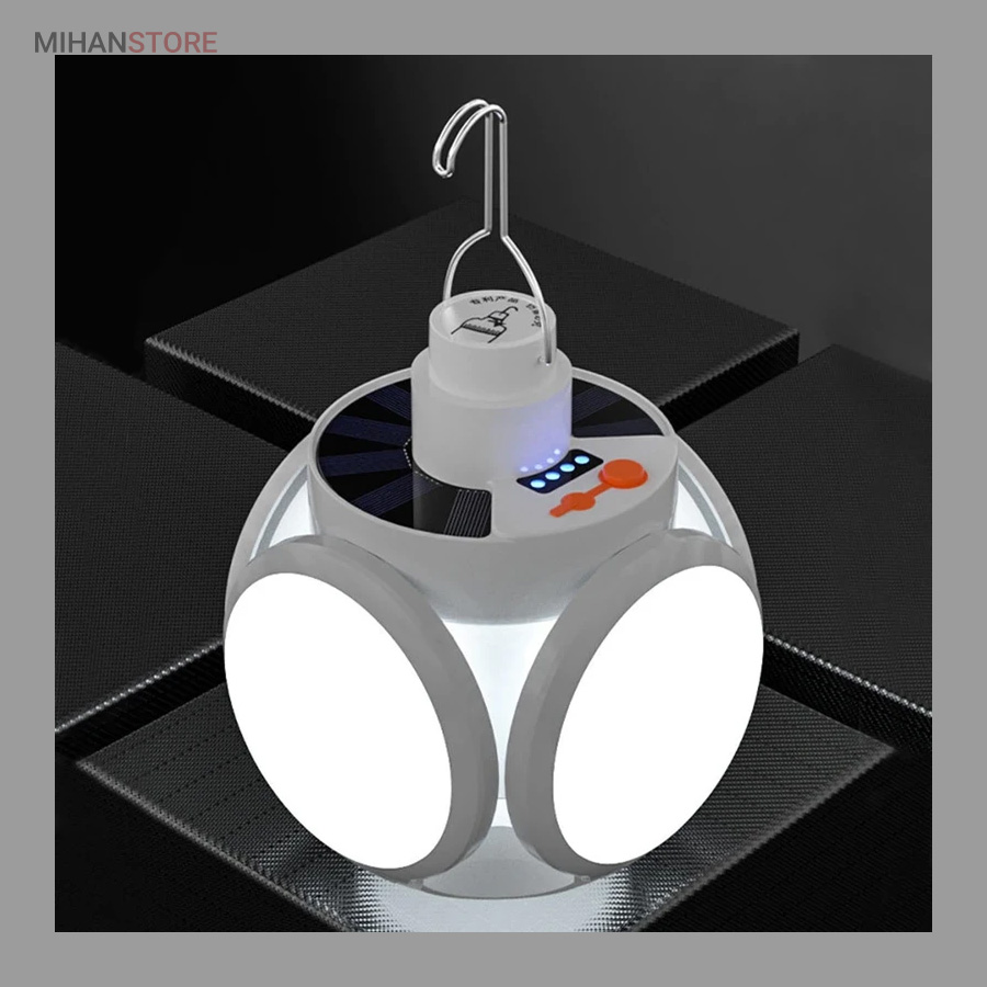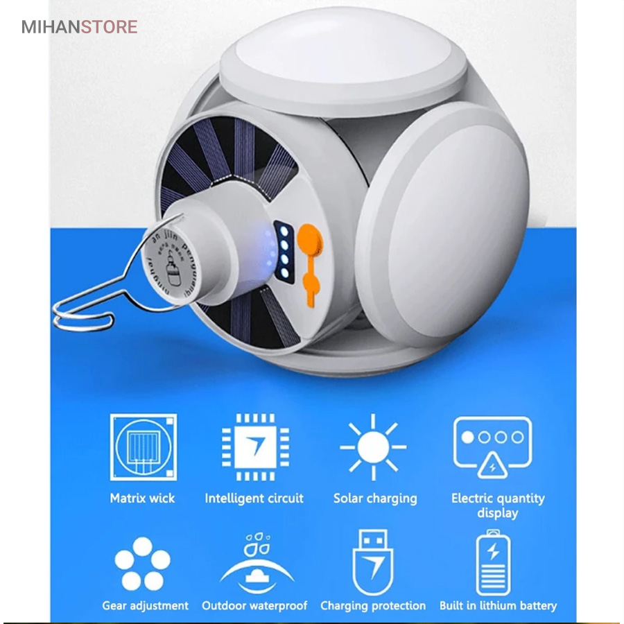 از ویژگی های دیگر این لامپ داشتن صفحه سولار می باشد و این خود می تواند بهترین کمک را در ذخیره انرژی داشته باشد، همچنین دارای میزان روشنایی 800 لومن و چراغ نشانگر شارژ در قسمت بالای لامپ نیز می باشد. منبع تغذیه لامپ توسط پنل خورشیدی و همچنین آداپتور می باشد. برای شارژ کامل لامپ، 5 ساعت زمان لازم است و با هر بار شارژ کامل، می توانید به مدت 6 تا 8 ساعت از نور آن استفاده کنید. باز شدن چهار ال ای دی این چراغ سولار زیبایی آن را دوچندان کرده است.سایز لامپ در حالت بسته (مدل توپ) 16x14x16 سانتیمتر میباشد در حالت سقفی باز 30x16x30 سانتیمتر می باشد.