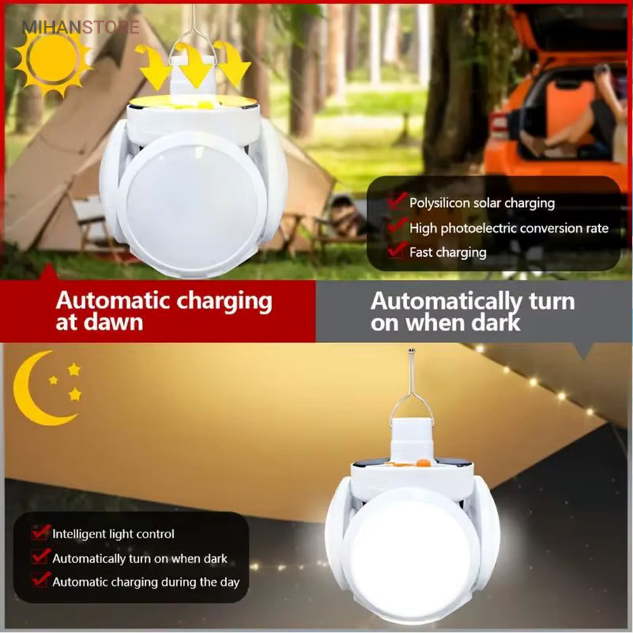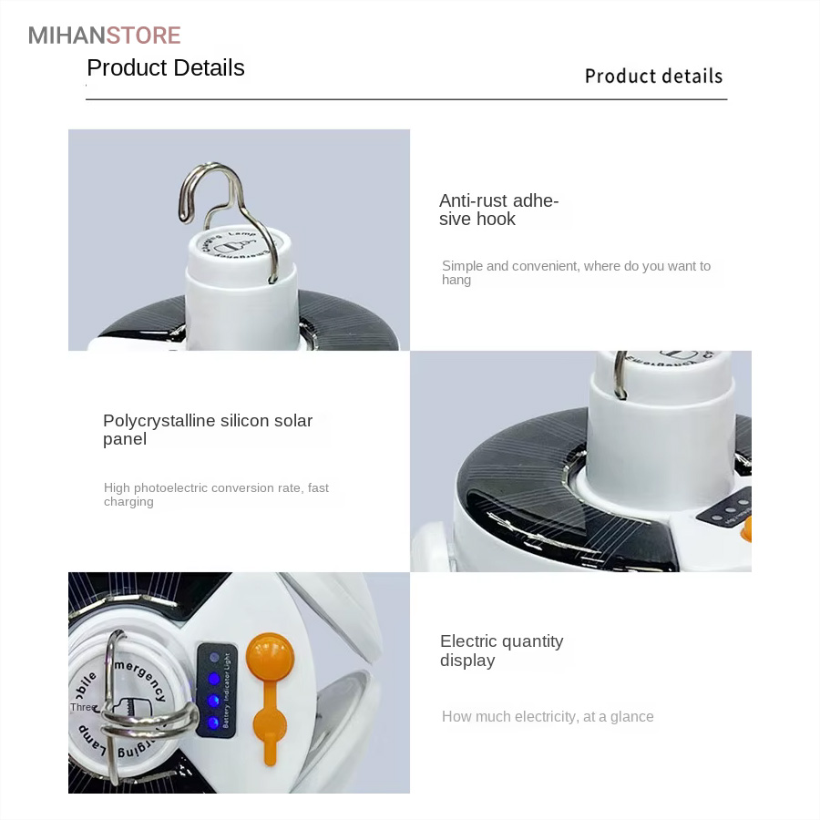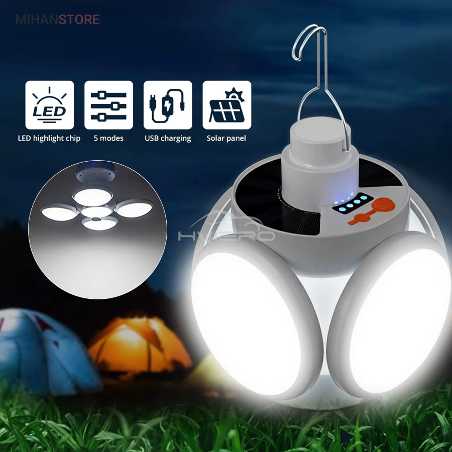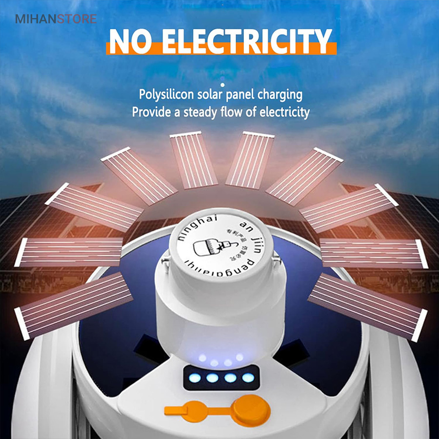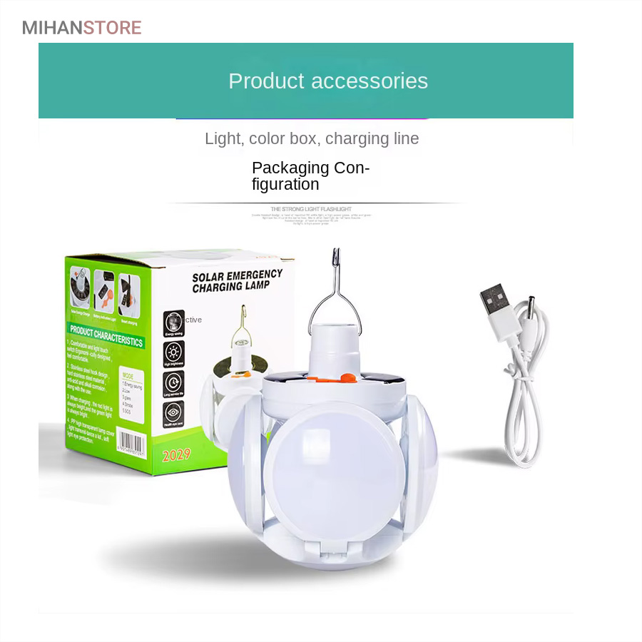از ویژگی های دیگر این لامپ داشتن صفحه سولار می باشد و این خود می تواند بهترین کمک را در ذخیره انرژی داشته باشد، همچنین دارای میزان روشنایی 800 لومن و چراغ نشانگر شارژ در قسمت بالای لامپ نیز می باشد. منبع تغذیه لامپ توسط پنل خورشیدی و همچنین آداپتور می باشد. برای شارژ کامل لامپ، 5 ساعت زمان لازم است و با هر بار شارژ کامل، می توانید به مدت 6 تا 8 ساعت از نور آن استفاده کنید. باز شدن چهار ال ای دی این چراغ سولار زیبایی آن را دوچندان کرده است.سایز لامپ در حالت بسته (مدل توپ) 16x14x16 سانتیمتر میباشد در حالت سقفی باز 30x16x30 سانتیمتر می باشد.