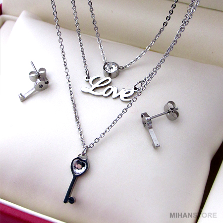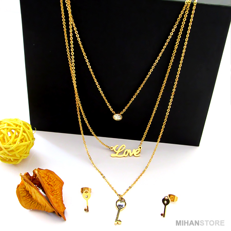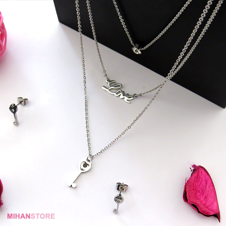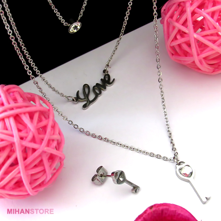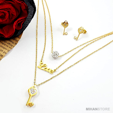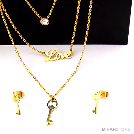 این نیم ست فوق العاده زیبا دارای گردنبندی سه زنجیره با پلاک های نگین درشت،Love  و کلید می باشد که سه زنجیر در انتها یکی شده و به راحتی با یک قفل به گردن شما آویخته می شود. از این رو بستن آن فوق العاده آسان و جلوه و نمای آن فوق العاده چشم گیر و مورد پسند افراد شیک پوش و خواستار تمایز می باشد. این نیم ست دارای دو گوشواره طرح کلید است که تکمیل کننده زیبایی گردنبند می باشد.