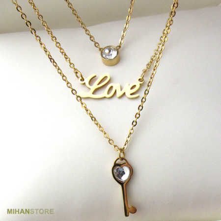 دارای گردنبند سه زنجیره با آویز های نگین، Love و کلید